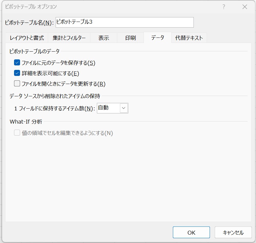 また、自動更新をオンにしているとデータが更新されるたびにピボットテーブルが更新されてしまいます。ファイルを軽くするためにも、手動で更新する設定に変更しましょう。