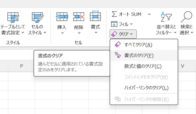 すべての書式を一括で削除したい場合は、「ホーム」タブの「編集」にある「クリア」から、書式のクリアを選択します。
