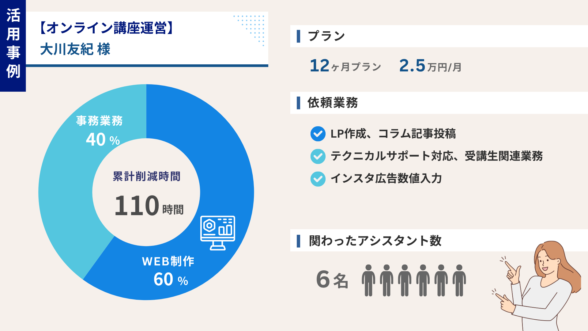 タスカルさんは、私の事業の「縁の下の力持ち」のような存在です。オンラインアシスタントサービスはたくさんありますが、タスカルさんは担当の方と密に連携しながら、安心して業務を任せられるのが大きな魅力です。