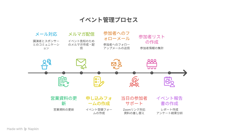 イベント開催のフローに沿って、事前準備、集客、当日対応、事後対応と大まかに分かれています。イベントの企画後、講演者やスポンサーが決定した段階から、タスカルさんには事務局としての実務サポートをお願いしています。