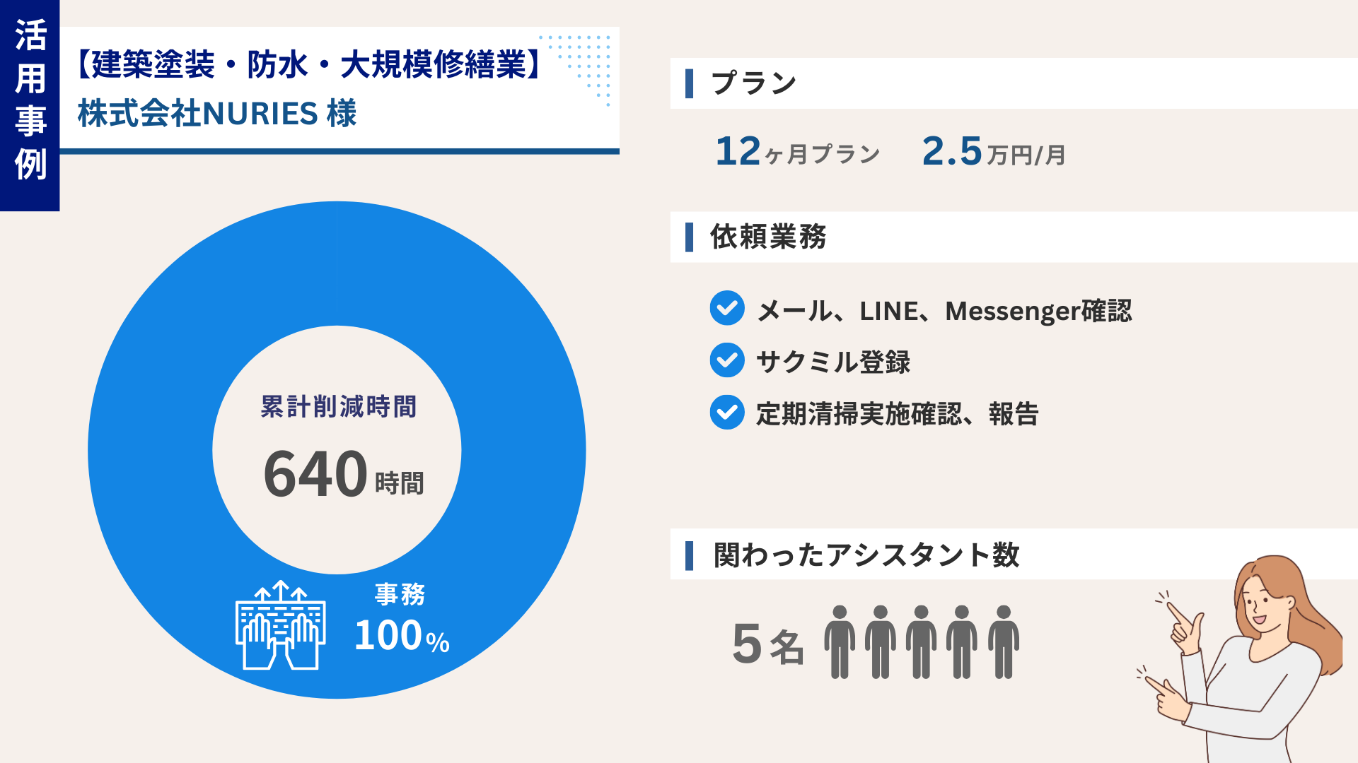 | タスカったポイント | 細かいタスクを任せることで、売上に直結する実務に専念できた |