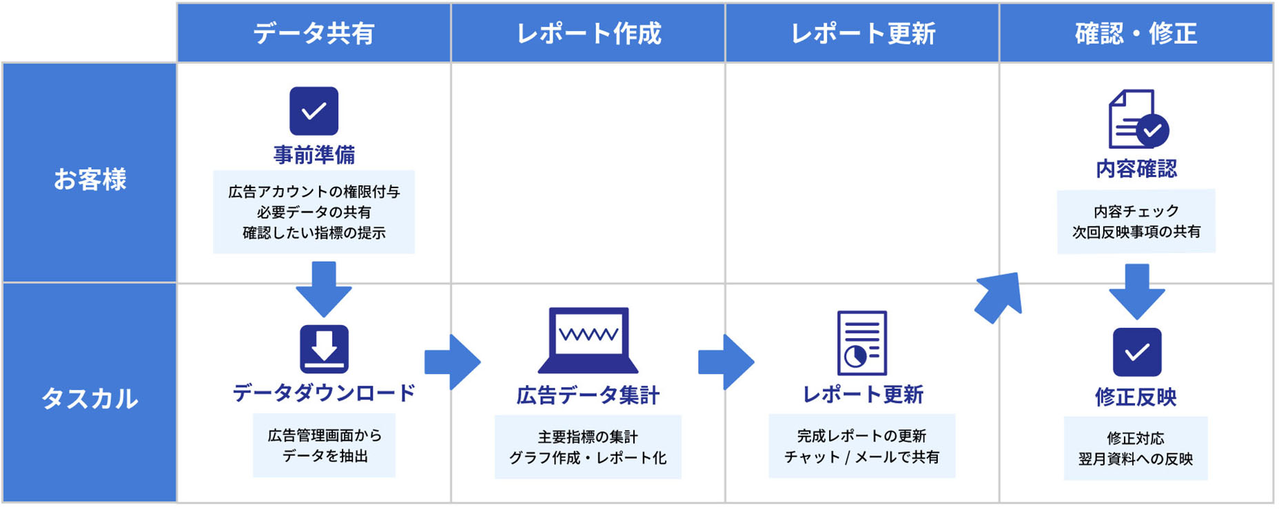 広告データの集計・整理からレポート作成まで代行し、数値の可視化と改善判断を