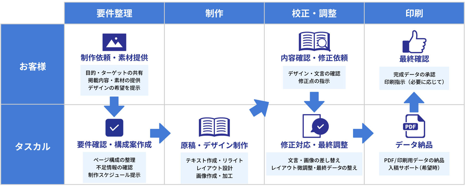構成整理や原稿作成、デザイン調整まで対応し、用途に応じた資料作成を