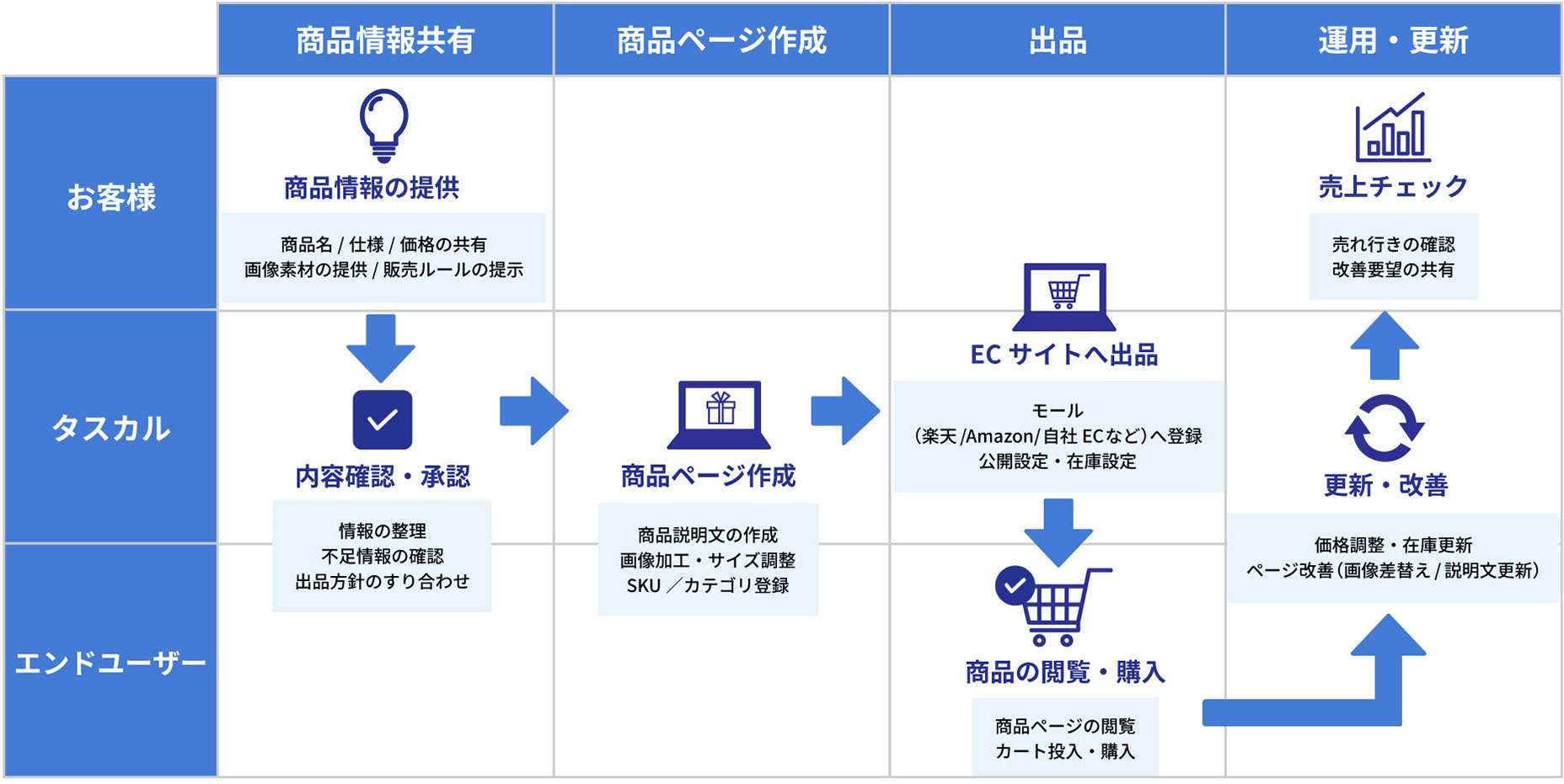 商品情報の登録、画像・説明文の更新、在庫データの反映などの作業は手間がかかります。タスカルに任せれば、作業の正確性とスピードが向上し、新商品投入にも柔軟に対応できます。
