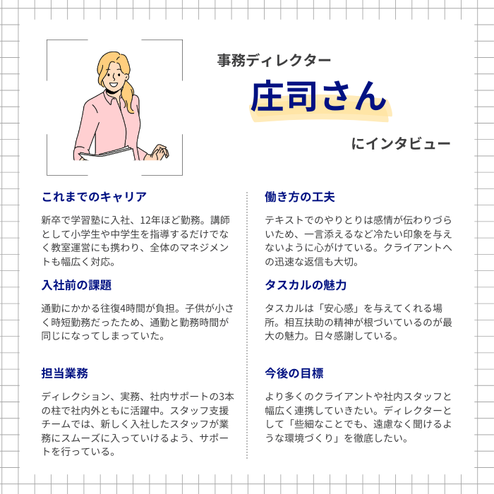 時間の縛りや制約で、キャリアを諦めてしまうのは、本当にもったいないです。私も以前、なかなかキャリアアップの面で難しい部分があったのですが、タスカルに入って、今はディレクターとして、毎日目標を持って頑張ることができています。