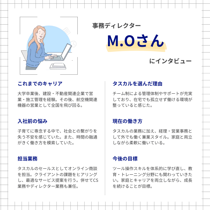 タスカルは、子育て中でもキャリアを諦めずに成長できる場です。ライフプランとキャリアプランの両立に悩んでいる方にこそ、ぜひ一歩踏み出してほしいです。