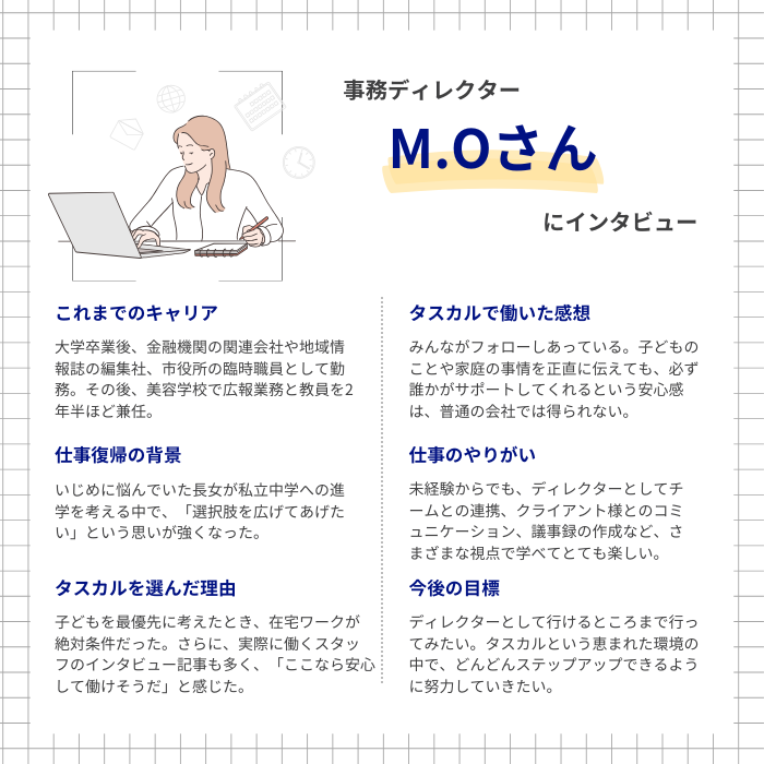 不安や葛藤を乗り越えて理想の働き方を追求するM.Oさんに、タスカルを選んだ理由やディレクターのやりがいなどについてお話を伺いました。