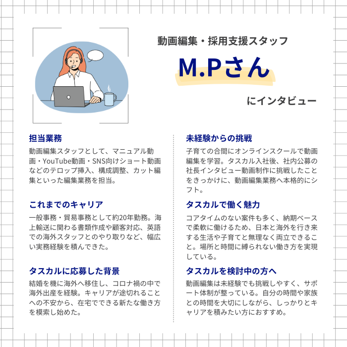 タスカルの動画編集チームを支える存在となったM.Pさんに、未経験からどのように動画編集のスキルを習得されたのか、タスカルで活躍するまでの道のりを伺いました。