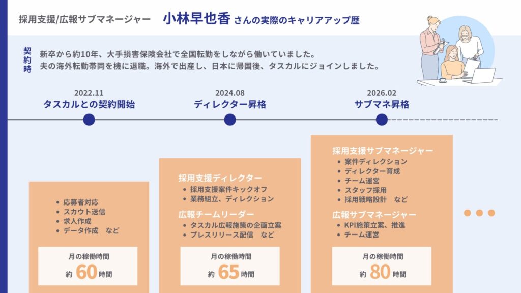 現在は採用支援チームと広報チームのサブマネージャーを兼任しています。採用支援ではクライアントから頂く採用支援案件の業務設計に加えて、ディレクターの育成やチーム運営を行っています。他にも、タスカルの採用チームとして、月に10~15名のスタッフの採用面談も担当しています。